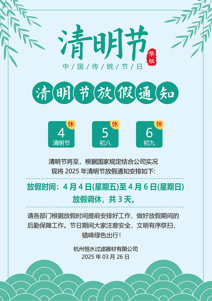 恒水過濾|2025年清明節(jié)放假通知